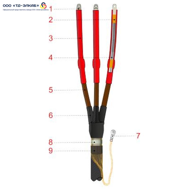 Муфта термоусаживаемая концевая внутренней установки для трехжильного кабеля с пластмассовой изоляцией из сшитого полиэтилена с ПРОВОЛОЧНЫМ экраном, С БРОНЕЙ, на напряжение до 10 кВ включительно 3ПКВТпН-Б-10-70…120-КПЭ (с наконечниками)